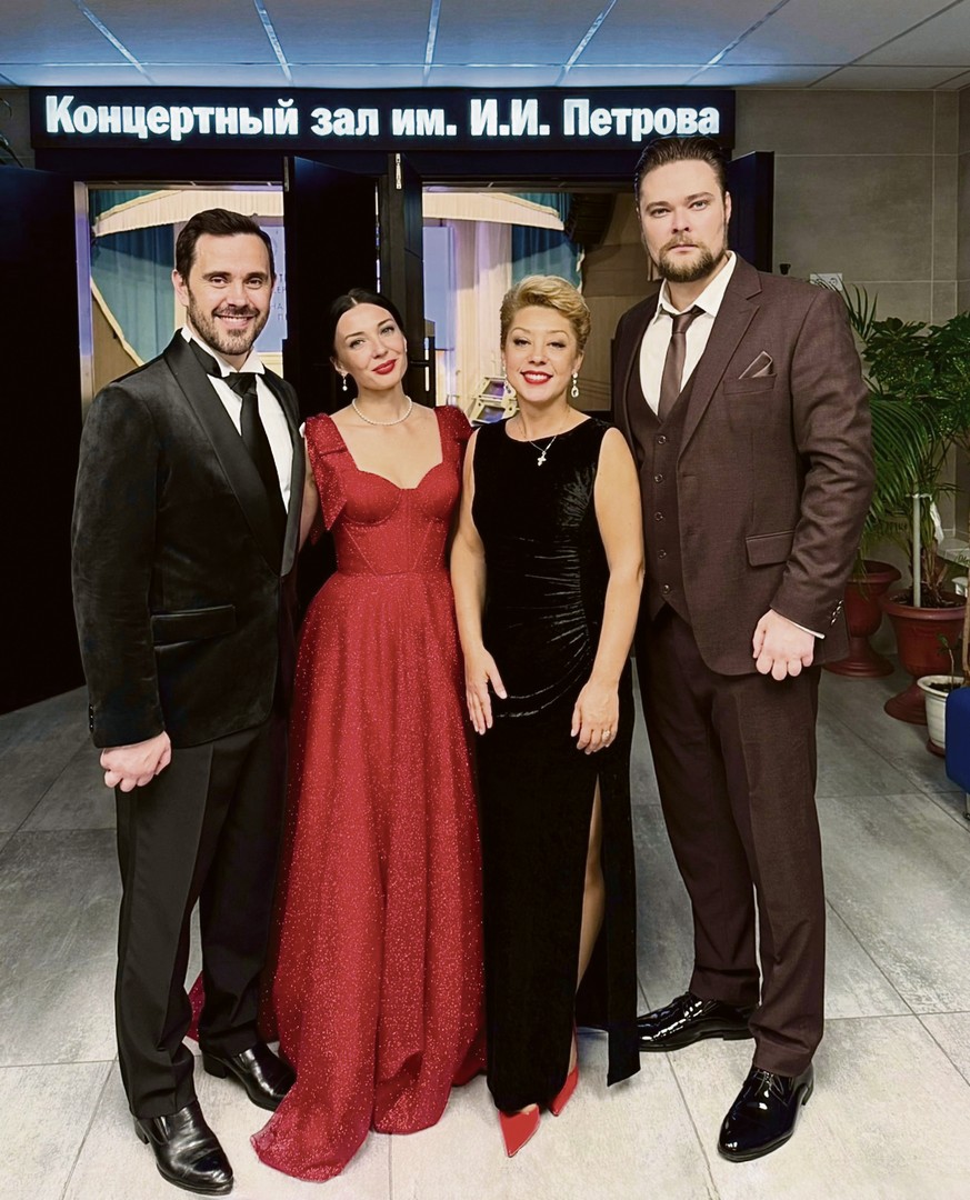 Фото с открытия концертного зала имени Ивана Петрова в Иркутске. «Это наш прославленный земляк, один из величайших оперных певцов XX века, солист Большого театра, народный артист СССР, дважды лауреат Сталинской премии», — написал Глеб Перязев в своих социальных сетях. На фото слева направо — коллеги Глеба: Гейрат Шабанов, Людмила Шер, Рената Сорвина и он сам