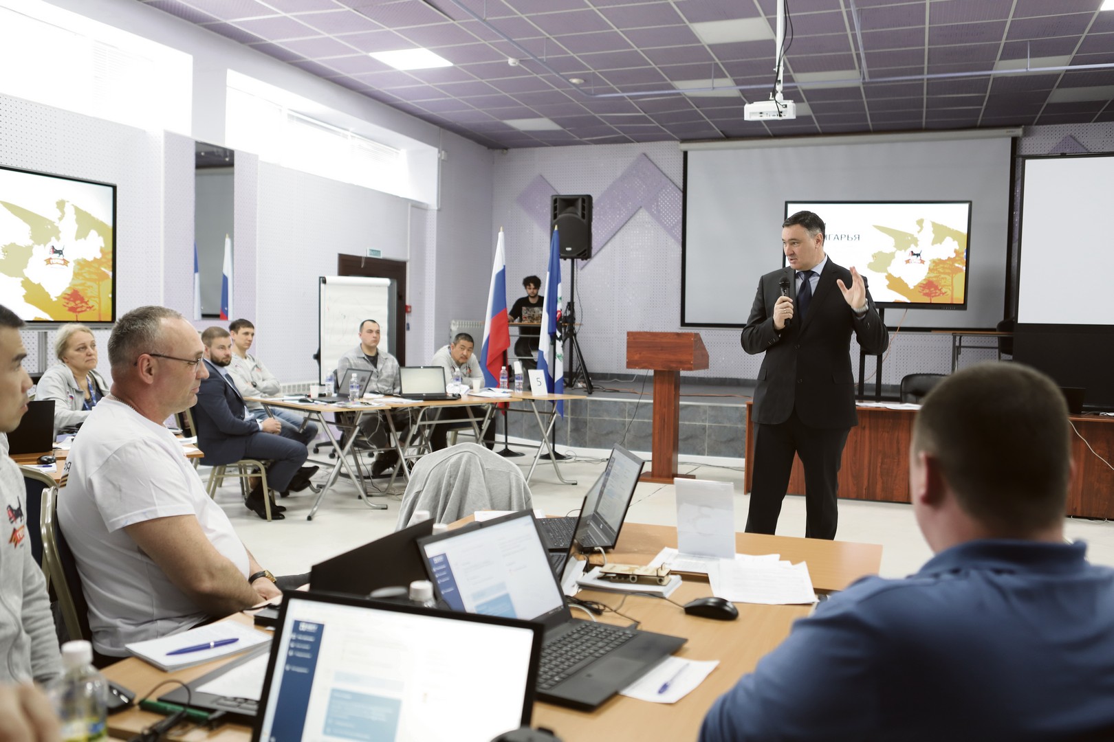 Свою лекцию Руслан Болотов начал с особых слов: он подчеркнул, что участники программы «Герои Приангарья» — это люди, которые имеют опыт управления ситуацией в сложнейших боевых условиях, обладают высочайшим уровнем стрессоустойчивости. И, безусловно, в руководящих кадрах страны все эти качества очень пригодятся.