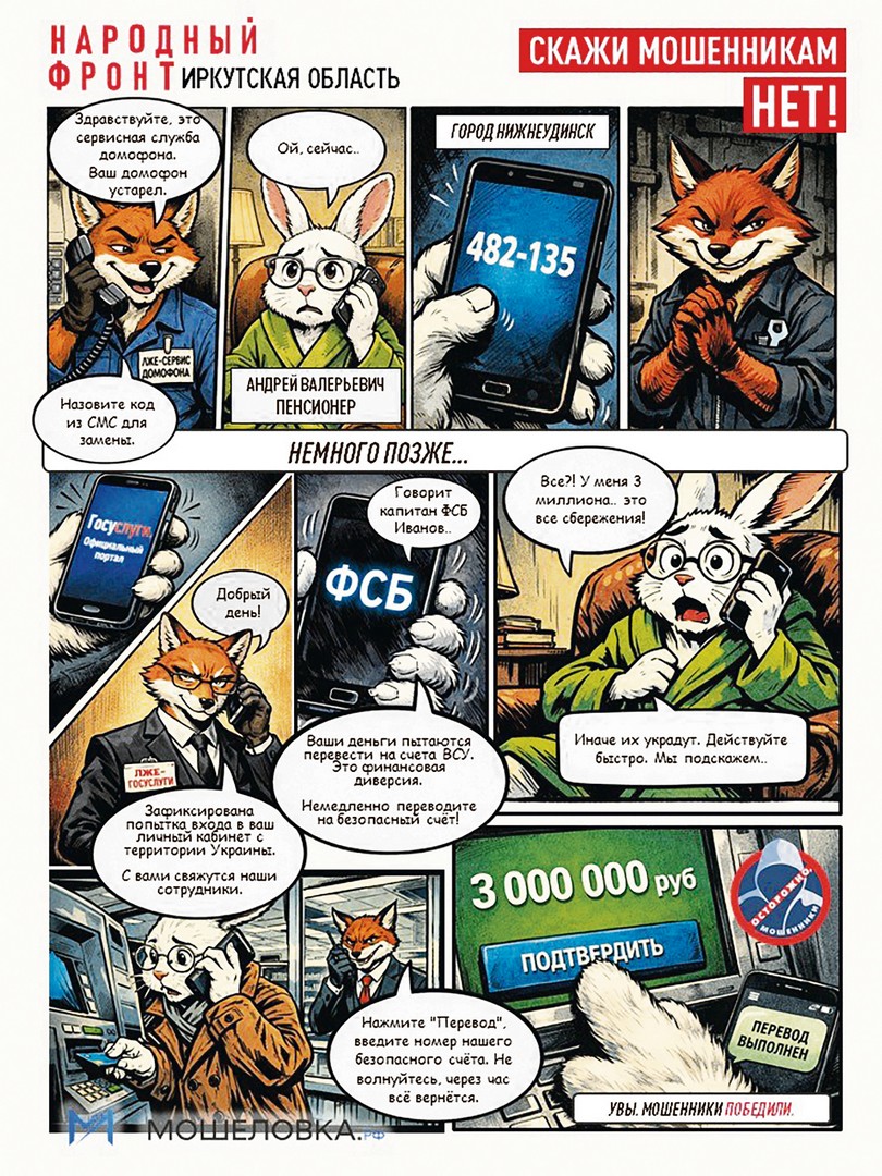 Вот такой невеселый комикс создали сотрудники Народного фронта. На рисунках — реальная история обмана: жертвой стал 61-летний пенсионер из Нижнеудинска. Он отдал аферистам более трех миллионов рублей