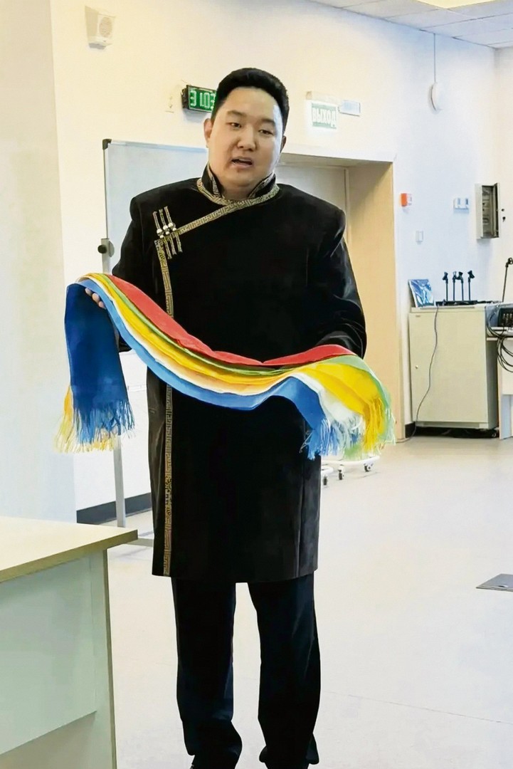 На одном из очных выступлений всероссийского конкурса «Педагогический дебют — 2026» иркутянин Зорикто Ринчинов выступал в бурятском национальном костюме. Ритуальные разноцветные шарфы — хадаки, буддийские символы, которые преподносят в знак почтения, дружбы, благопожелания и уважения, подчеркнули идею презентации на тему «У меня это хорошо получается»