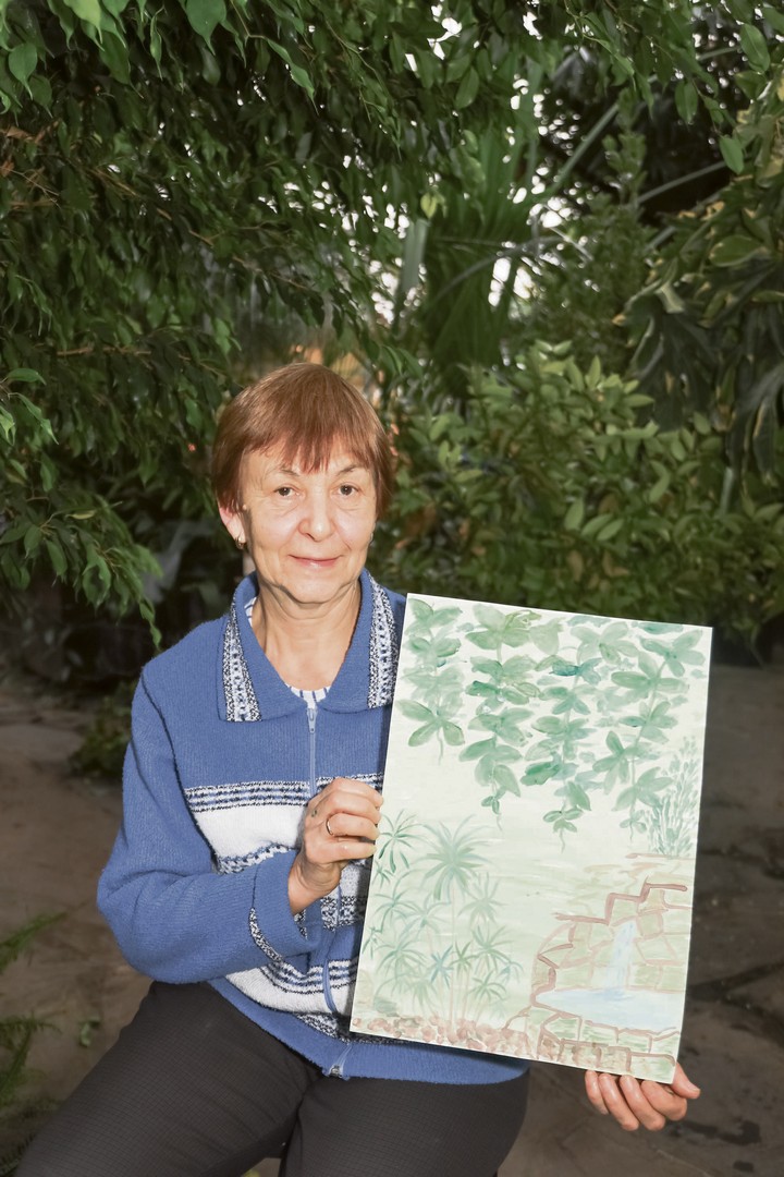 — Сегодня у нас здесь пленэр, участницы приехали из разных районов Иркутска. Нашим живописцам очень нравится эта локация: атмосфера оранжереи умиротворяет, успокаивает, рисовать здесь очень комфортно. Само пребывание зимой в тропиках, где все зеленое, уже настраивает на позитивный лад, — объясняет Яна Ковалевская, преподаватель курса «Искусство и творчество» проекта «Активное долголетие».