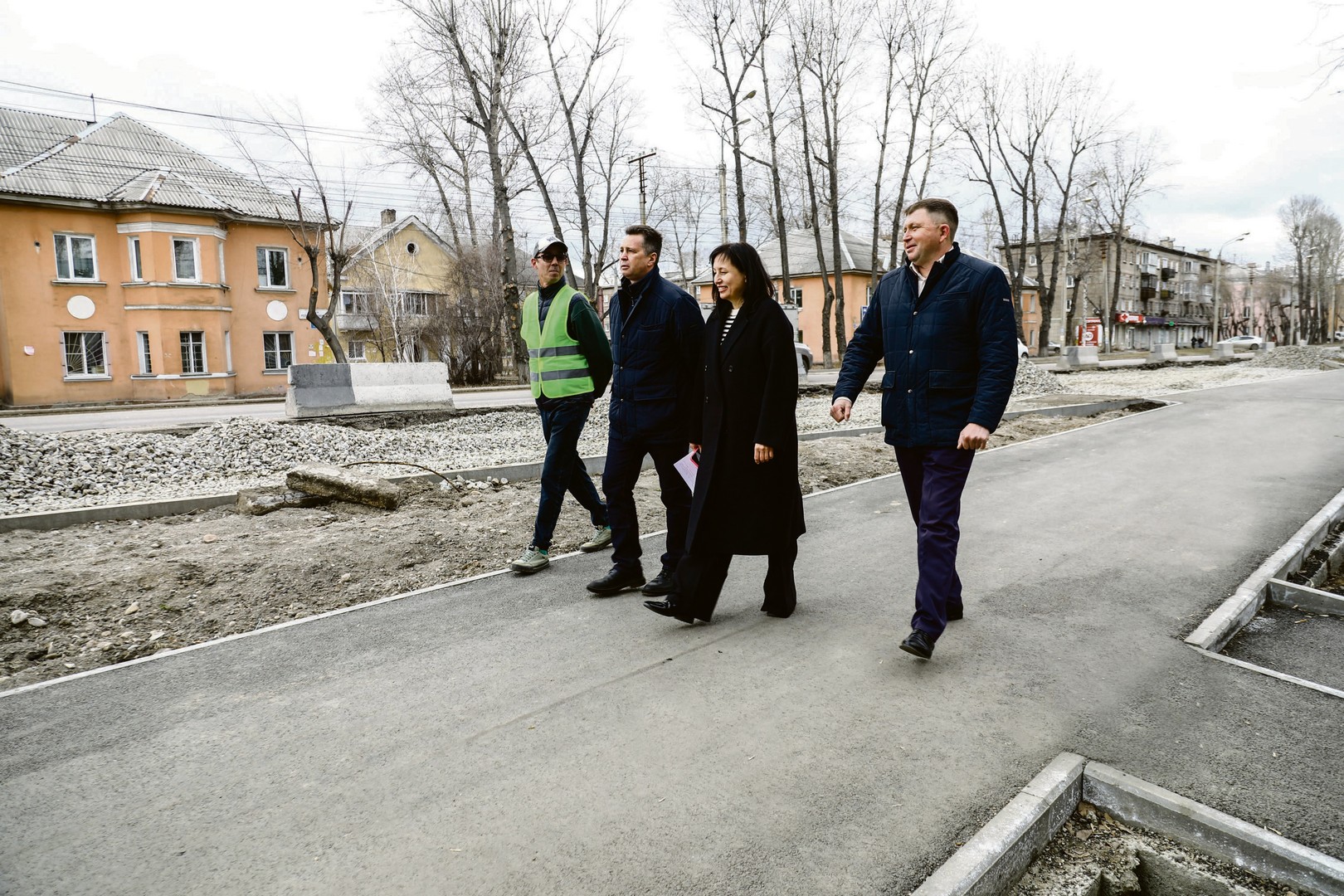 Глава Ленинского округа Светлана Колотовкина, руководитель «Иркутскавтодора» Василий Ефремов и начальник департамента дорожной деятельности и транспорта администрации города Сергей Яременко шагают по новому тротуару вдоль улицы Розы Люксембург, который сделали там в прошлом году. А в этом сезоне здесь предстоит уложить 28 тысяч квадратных метров асфальта на проезжей части и еще восемь — на тротуарах